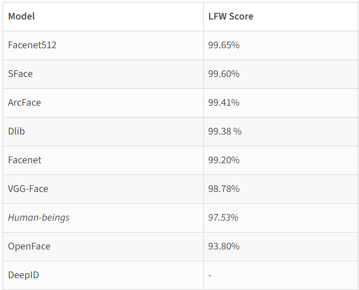Human beings scored an accuracy of 97.53, outperformed by Facenet512, SFace, ArcFace, Dlib, Facenet, and VGGFace. These are the newest models available mostly depending on deep convolutional neural networks storing the relationships between facial features and storing them in facial embedding vectors for later comparison, recognition, and finally labeling.