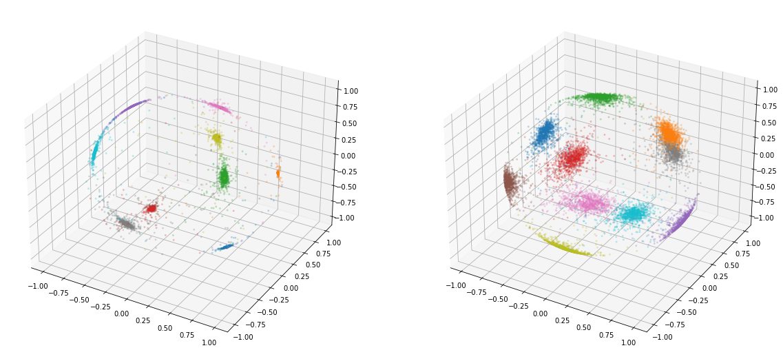 Thus, it makes sense that cosine similarity would be the best fit for this model. Anyhow, ArcFace provides more compact clusters compared to softmax as shown below:
