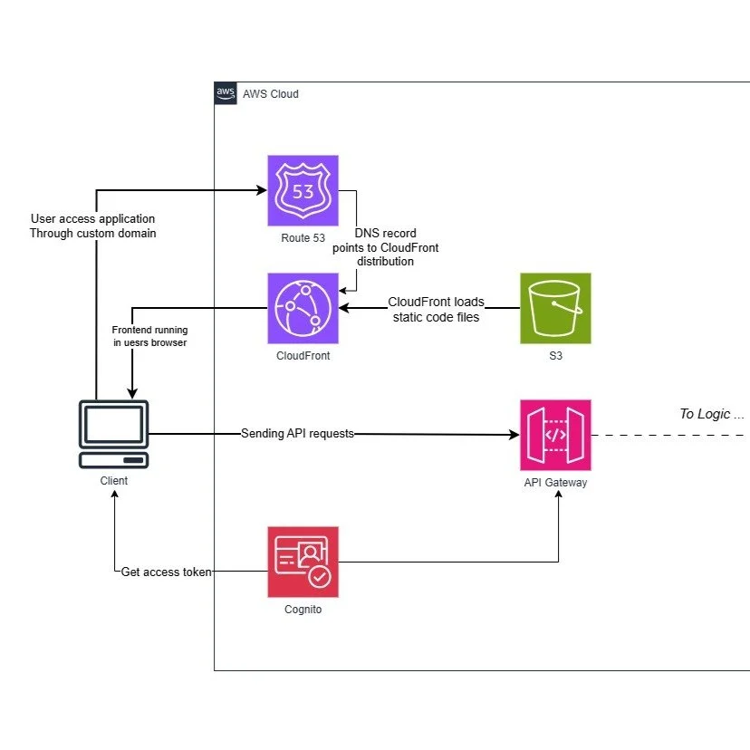 The web application connects to the logic calling the APIs through AWS API Gateway, which is a service for creating, publishing, maintaining, monitoring, and securing REST, HTTP, and WebSocket APIs at any scale (8).